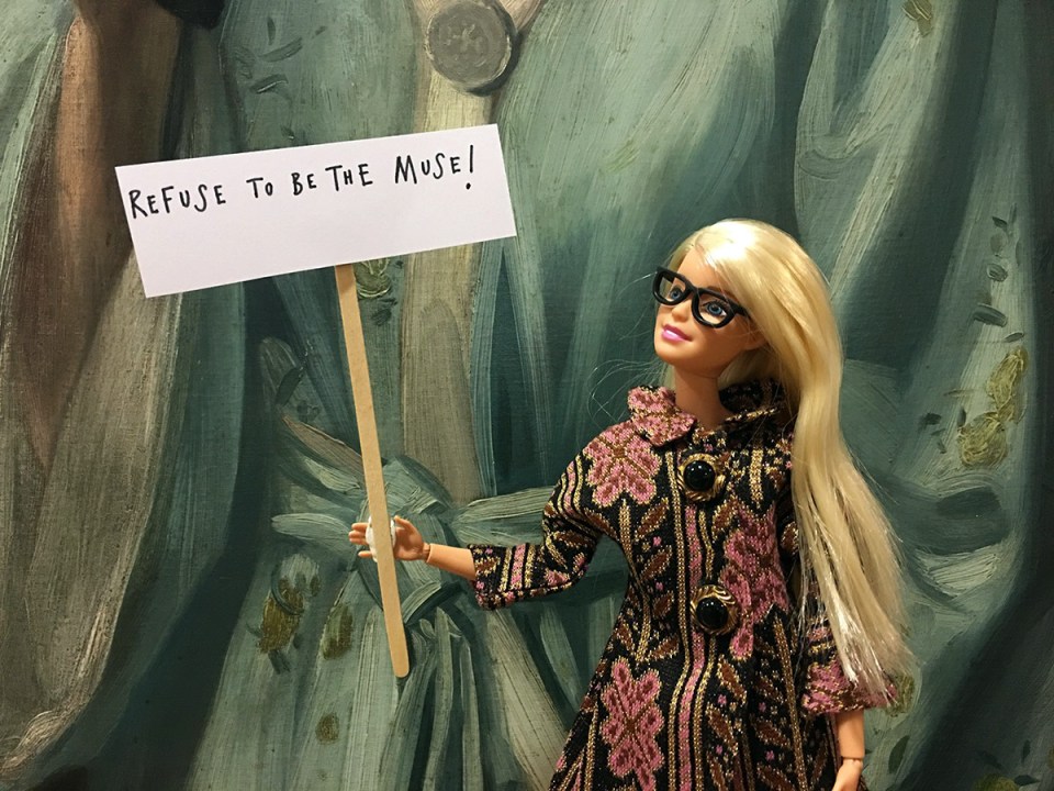 «Bienvenido al palacio patriarcal de la pintura, aquí hay 2.300 obras de varones y 21 obras de mujeres», se lee en una de las pancartas que sostiene la siempre sonriente muñeca en su cuenta de Twitter @BarbieReports, que su creadora define como una «práctica estética, performativa y pedagógica crítica».