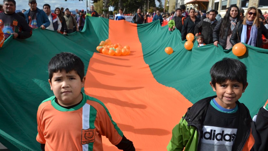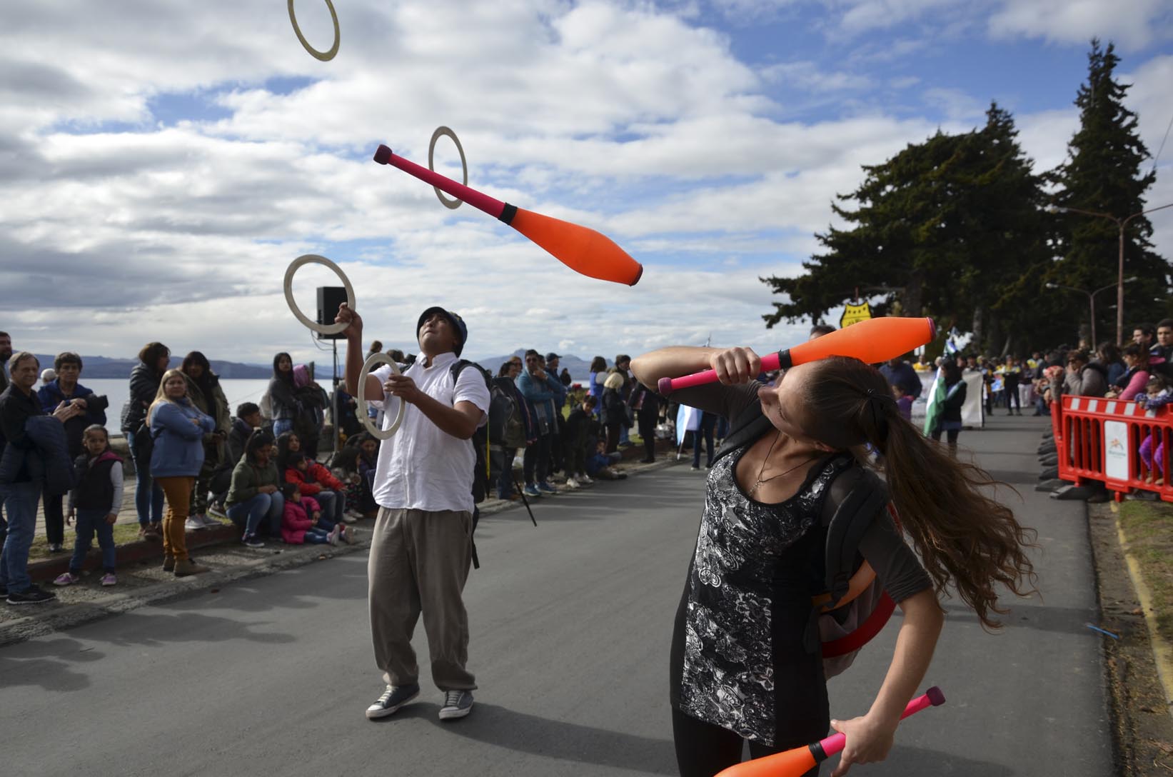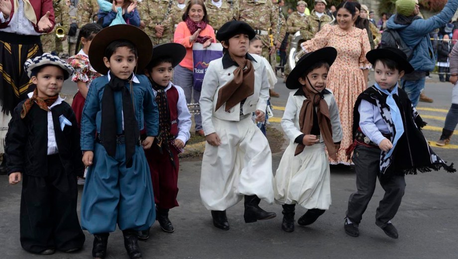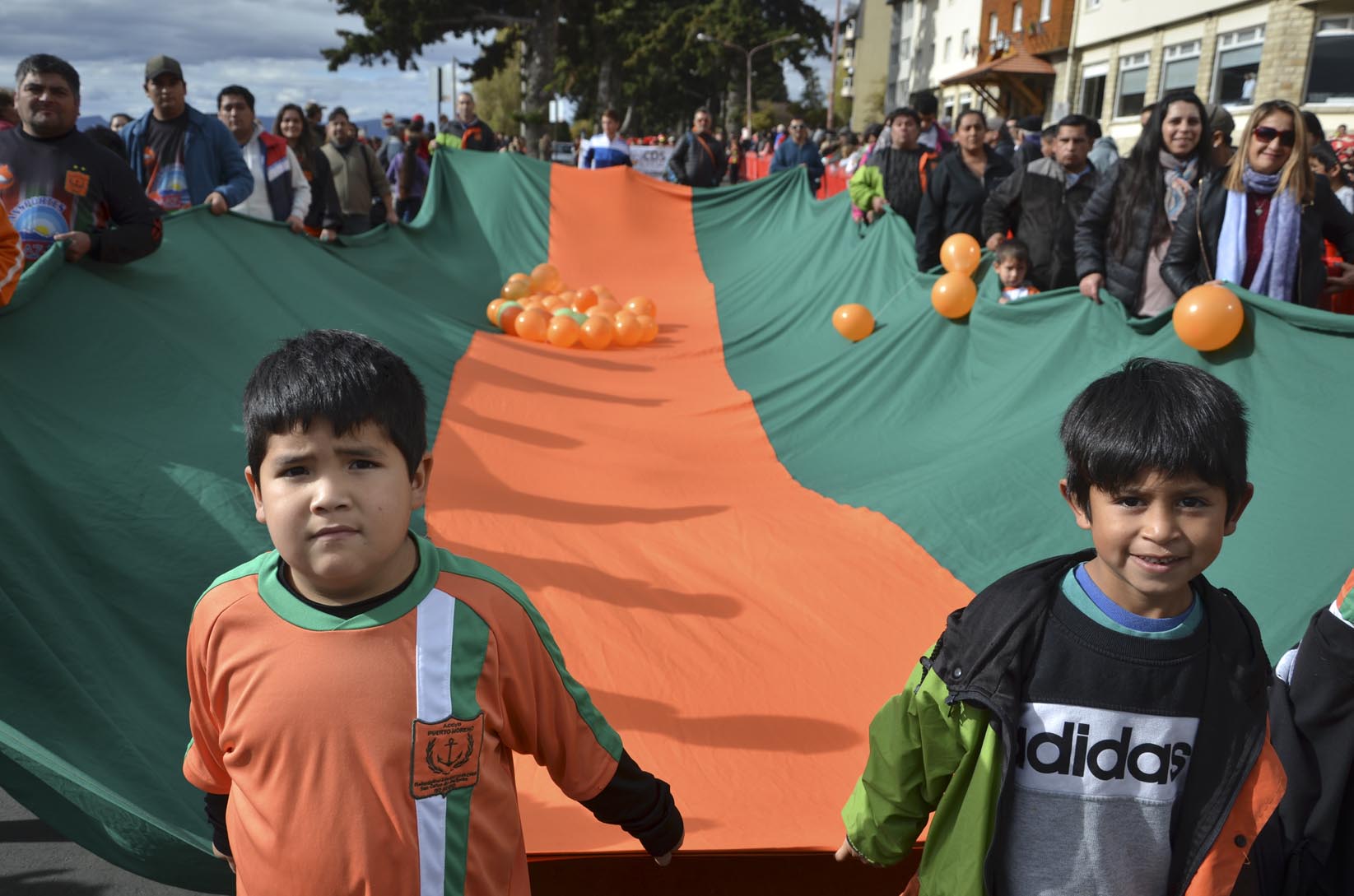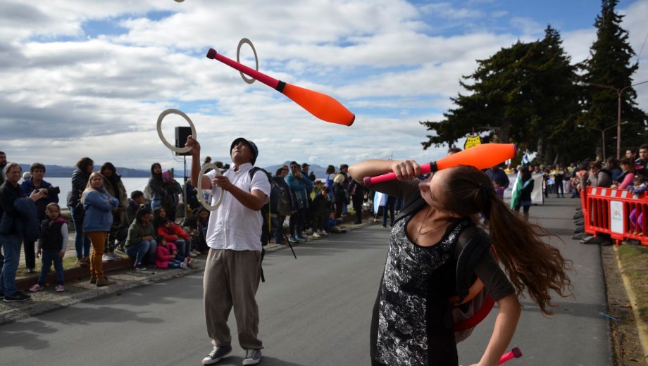 Durante tres horas, un tramo de la costanera de Bariloche se vio envuelto en sonidos y colores. Murgas, sirenas, galopes, guitarras, pequeños gauchos zapateando, payamédicos bailando y, banderas. Gran cantidad de banderas flameando al paso de quienes las agitaban con orgullo. Cada tanto, se escuchaba la letra del Feliz Cumpleaños.