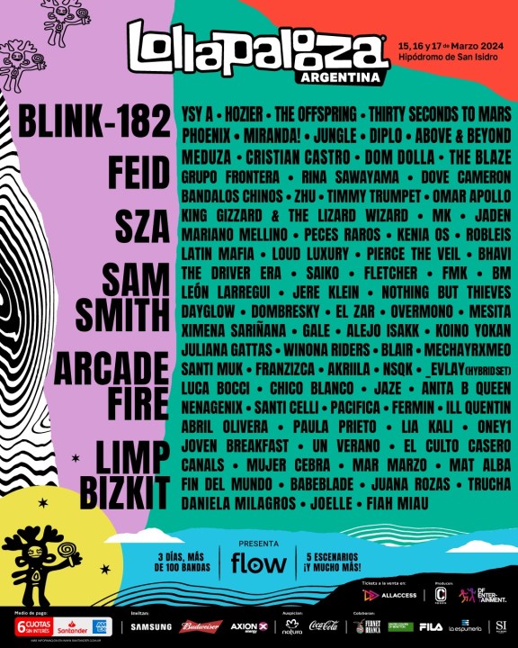 El debut absoluto en nuestro país de Blink-182, que en la edición de marzo de este año debió cancelar a último momento su participación; y de SZA; el regreso de Arcade Fire y de Limp Bizkit; y la presencia del ícono pop Sam Smith son algunas de las principales atracciones que tendrá Lollapalooza Argentina 2024, que se realizará los días 15, 16 y 17 de marzo en el Hipódromo de San Isidro.