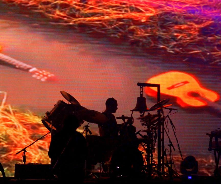 R: “Baterísticamente”, digamos que no es que buscamos un sonido “retro” ni de los discos, conceptualmente, el espectáculo está pensado con el sonido del “push” del vivo. Tratamos de que todos los arreglos de los discos estén sobre el escenario, en nuestra interpretación en vivo, con la fuerza sonora del “push”. En la batería, es tratar de armar un set del baterista y del percusionista que tienen ahí, por eso tengo una campana, un bombo con efecto, rototons, accesorios para hacer los dos laburos. Esa es mi parte y después tratar de apelar a la parte interpretativa en cuanto a los matices, en la ejecución.