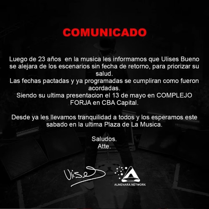 “Las fechas pactadas y ya programas se cumplirán como fueron acordadas”, agregó el documento, dando a entender que Ulises Bueno realizará su última presentación musical, al menos por ahora, el 13 de mayo en Complejo Forja, en Córdoba Capital