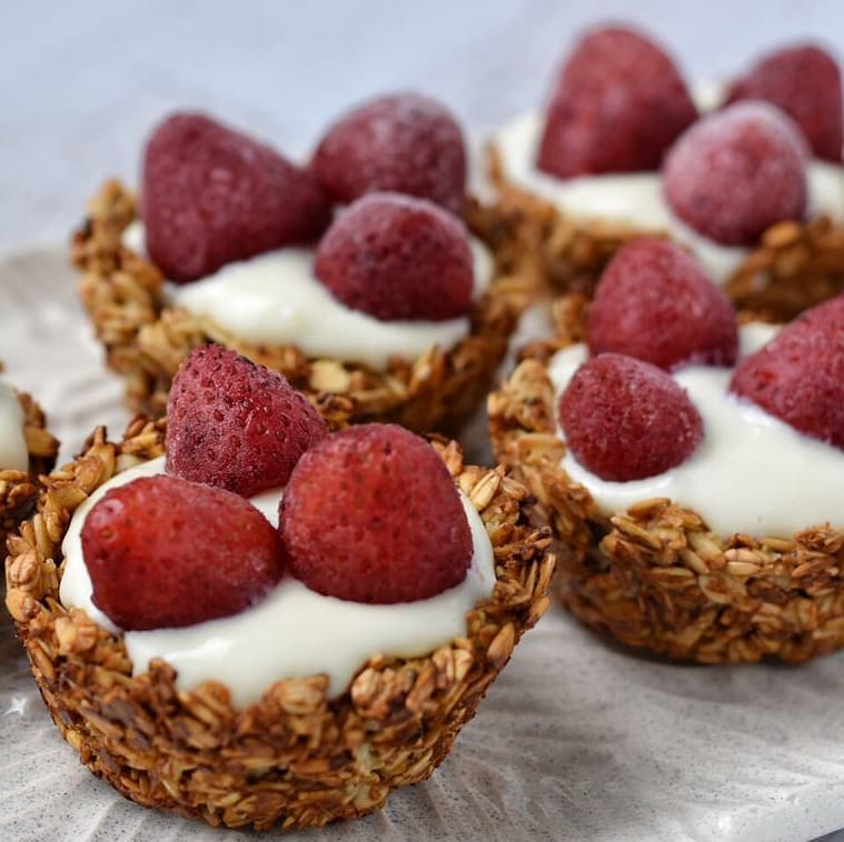 Mezclar el coco, la granola y el huevo, colocarlo en un molde de muffins y cocinar hasta que doren.