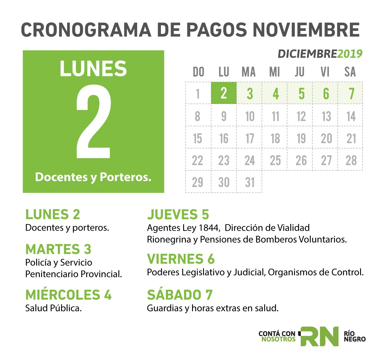 El gobierno de Río Negro confirmó el cronograma salarial de noviembre, que anunció su inicio desde el lunes 2 de diciembre con los docentes. En realidad, esos depósitos ya estarán disponibles a partir del sábado próximo.