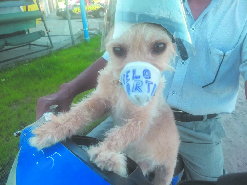 Cuando Manuel pone la moto en marcha, Chelo se prepara para el paseo. En días fríos, además de tener su casco de protección, Manuel le hizo con sus propias manos un chaleco. Cuando hay mucho sol, Chelo usa las antiparras. Todos los accesorios perrunos los fabricó Manuel. Nos contó que el casco lo hizo con una bocha de los flotantes de tanques de agua, luego lo forró por dentro y pintó.