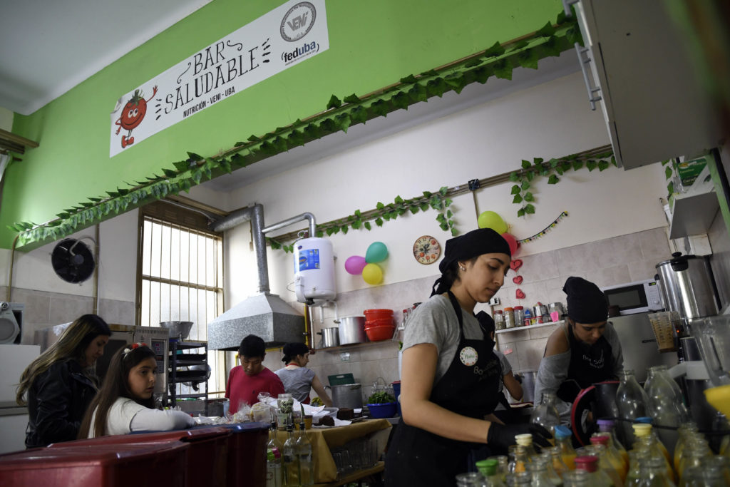 Noelia Sabinio, de 29 años, graduada de la carrera, coordina el bar y trabaja junto con 12 estudiantes en la preparación de 500 platos diarios a 60 pesos, con vegetales y carnes magras.