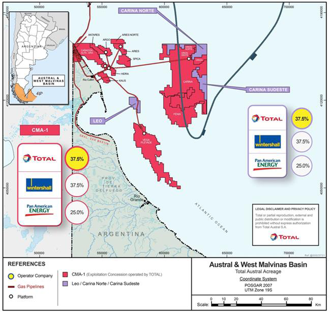 La planta está ubicada en la costa al norte de la Provincia de Tierra del Fuego y allí se procesa la producción de 7 yacimientos offshore y onshore operados por Total Austral que posee el 37,5% del consorcio. La sociedad entre DEA Deutsche y Wintershall posee otro 37,5% mientras que Pan American Energy es dueña del 25% restante.