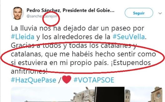 Varias publicaciones compartidas en miles de ocasiones en redes sociales se hacen eco de una visita del presidente del Gobierno español, Pedro Sánchez, a la ciudad catalana de Lleida, con un tuit atribuido al mandatario en el que éste dijo: «Me habéis hecho sentir como si estuviera en mi propio país», en referencia al conflicto independentista catalán. Sin embargo, la cuenta de Twitter no es la oficial del líder socialista sino una parodia.