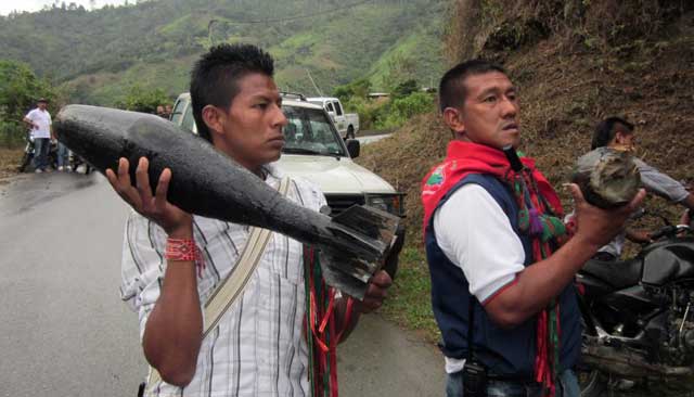 Una publicación que supuestamente muestra a dos manifestantes cargando artefactos explosivos durante una protesta indígena reciente en Colombia ha sido compartida al menos 12.000 veces en redes sociales. Aunque la imagen es real, fue tomada en 2012 y muestra a dos indígenas retirando material bélico de su territorio.