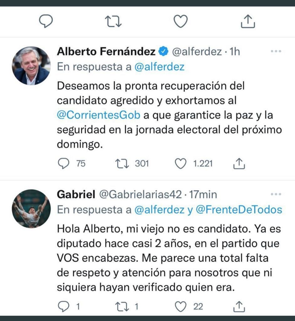 El presidente Alberto Fernández se expresó a través de sus redes sociales acerca del violento episodio vivido en Corrientes donde el diputado provincial Miguel Arias fue baleado en el acto de cierre de campaña pero cometió un error que generó el enojo de la familia.