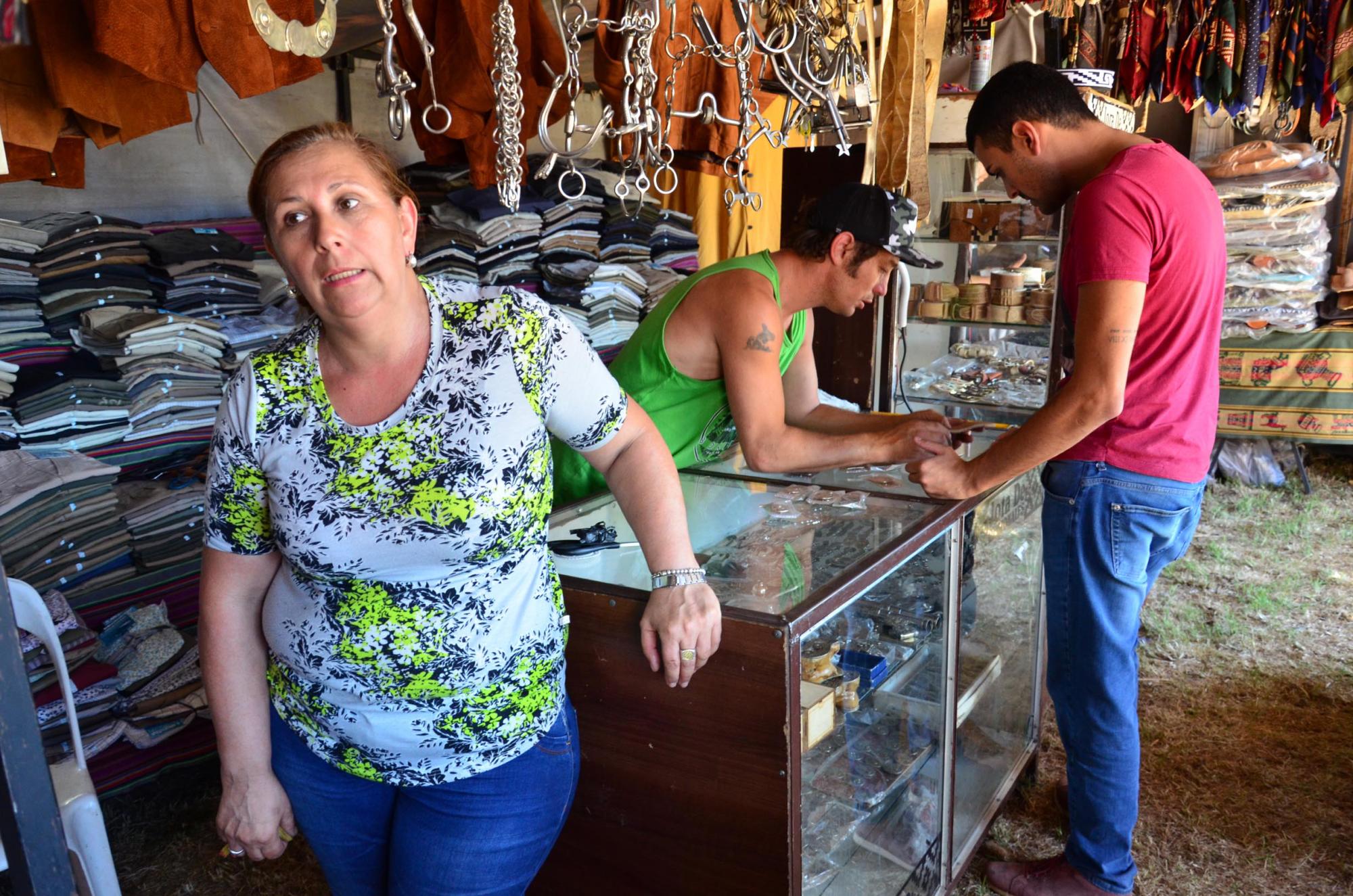 “Nos dedicamos hace 20 años a la talabertería y hemos recorrido casi todo el país”, cuenta Mary, de JD Regionales, un puesto de ropa y artículos de campo ubicado a pocos metros de la entrada por Costanera y Patagonia. Mientras, su marido corta unas verduras para cocinar en la anafe del puesto.