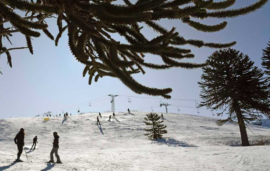 En el cerro se esquía de cara al lago y entre araucarias milenarias, al pie de un volcán activo que da vida a la villa termal de Copahue, tapada de nieve.