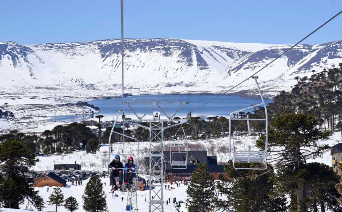 En el cerro se esquía de cara al lago y entre araucarias milenarias, al pie de un volcán activo que da vida a la villa termal de Copahue, tapada de nieve.