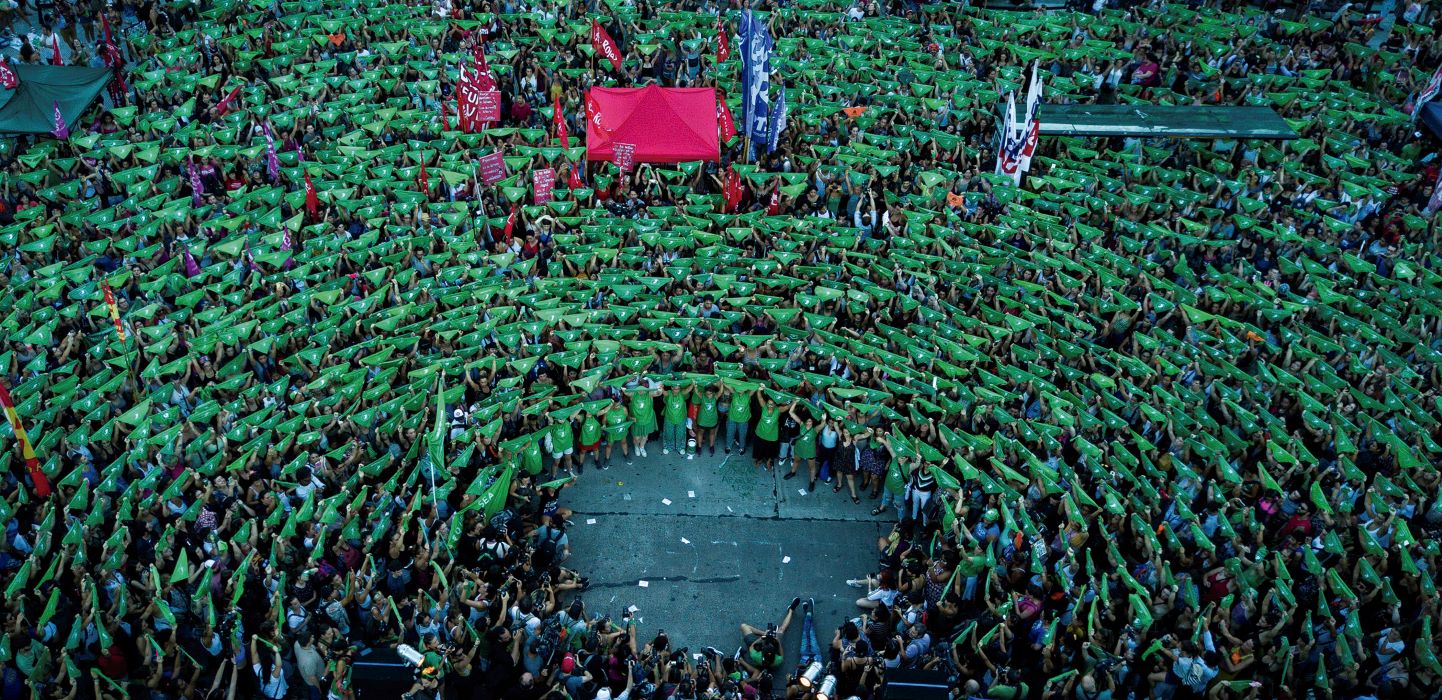 En otra de las fotografías, se exhibe la potencia de la marea verde y feminista condensada en uno de los tantos pañuelazos que tuvieron lugar desde el 2018 para acompañar el reclamo por la despenalización del aborto y el respeto por los cuerpos de las mujeres como centro.