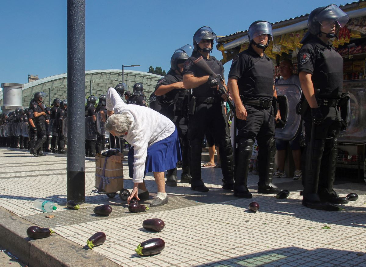 Entre las imágenes seleccionadas, se puede ver cómo durante una de las medidas de protesta llevadas adelante en Constitución por pequeños productores agropecuarios y conocidas como verdurazo , tras la represión de la policía una persona mayor recoge unas berenjenas que han quedado como testigo mudo del acto solidario y de visibilización, que contrasta con la fuerza de los uniformados.