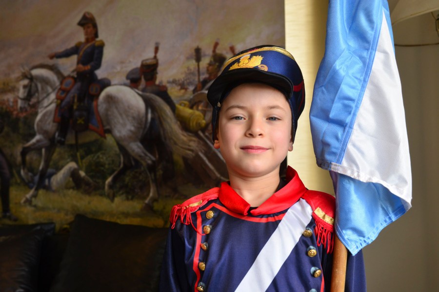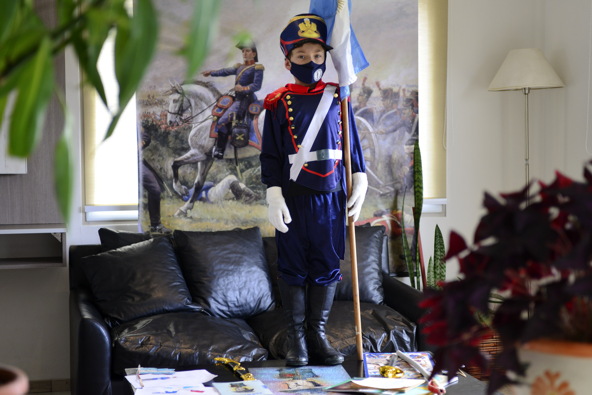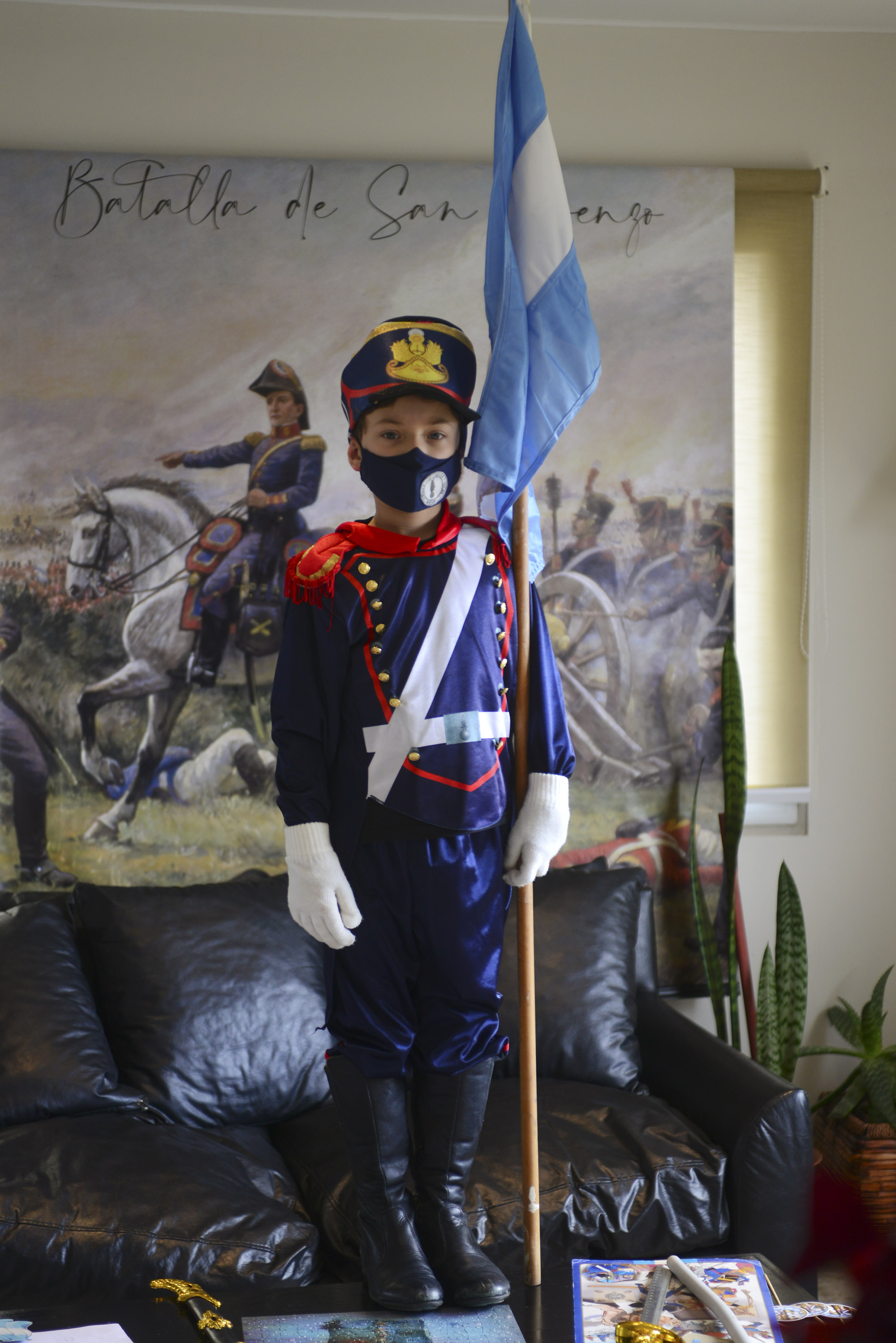 Para su madre, organizar un cumpleaños temático de San Martín resultó todo un desafío. Encargó una torta con el logo del Regimiento de Granaderos a Caballo y una gigantografía con el Combate de San Lorenzo. Su abuela estuvo a cargo del traje de granadero que lució con las botas de su madre.