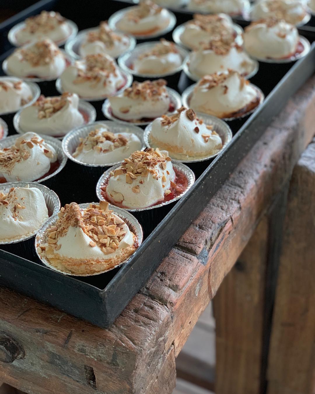 Por otro lado hacer un merengue con 150 de claras y 300 gr de azúcar y colocarlo sobre las frutas. Agregar un poco de almendras picadas para después agregarlo sobre las frutas ya asadas.