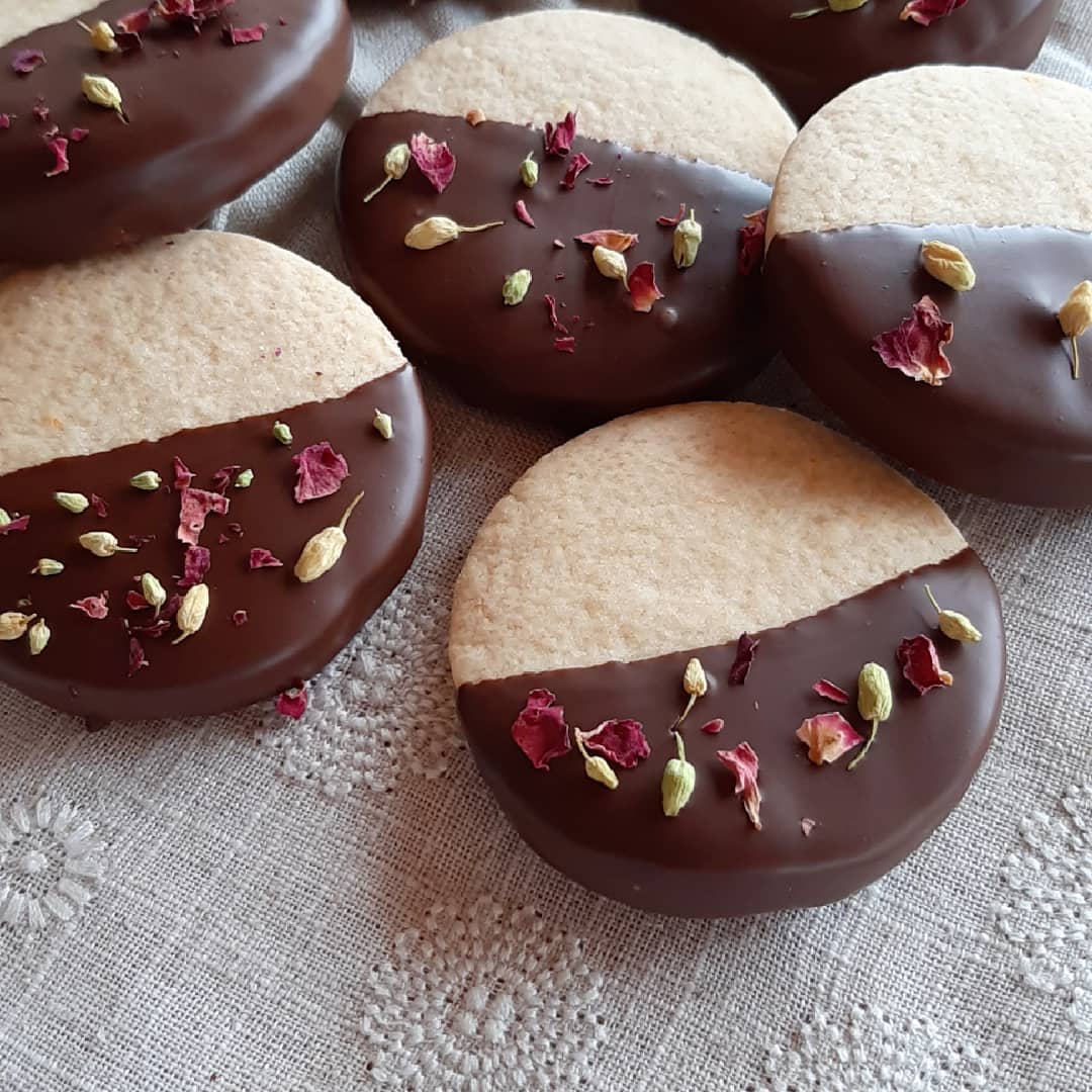 Estirar entre 2 films o en una bolsita y llevar a la heladera por media hora. Cuando está fría cortar círculos, colocarlos en placa de horno. Luego se llevan a horno a 180° C por 12 minutos o 15, las vas mirando. Una vez frías, decorar con chocolate de repostería, que se calienta a baño maria. Al final decoramos con pétalos de rosas y florcitas de nabo, si querés.