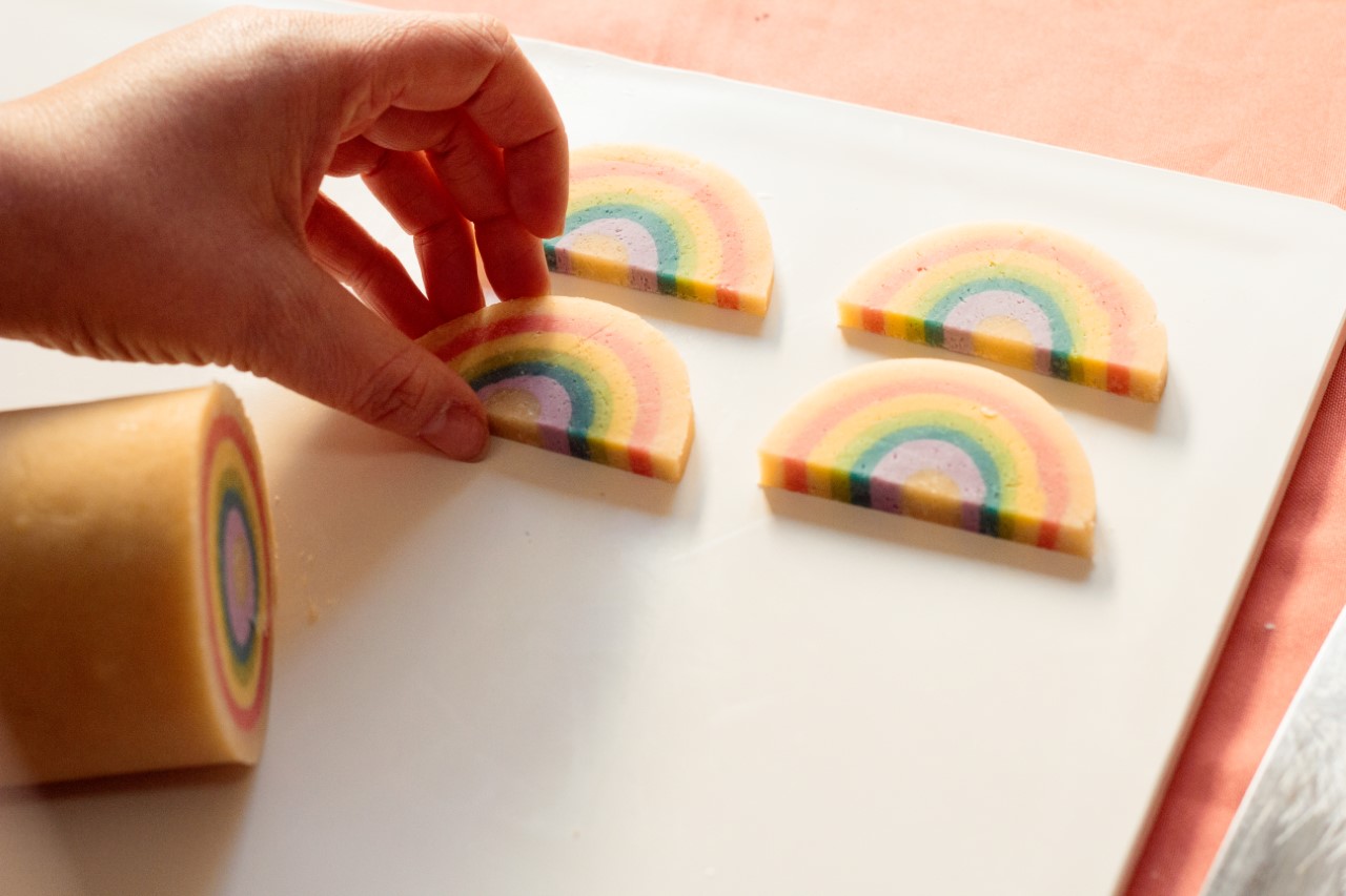 Cortar el cilindro en rebanadas y éstas a su vez por la mitad. De ese modo nos quedan las galles en forma de semicírculo con un diseño de arcoíris. Llevar a frío unos minutos antes de hornear para que no pierdan la forma.