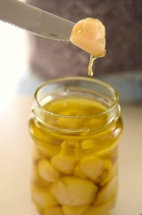 Calentar en una olla el aceite, pelar los ajos y asar hasta que estén tiernos. Si querés perfumar con alguna hierba, agregarla cuando apagan el fuego así se infusiona bien. Guardar en frasco esterilizado preferentemente en heladera.