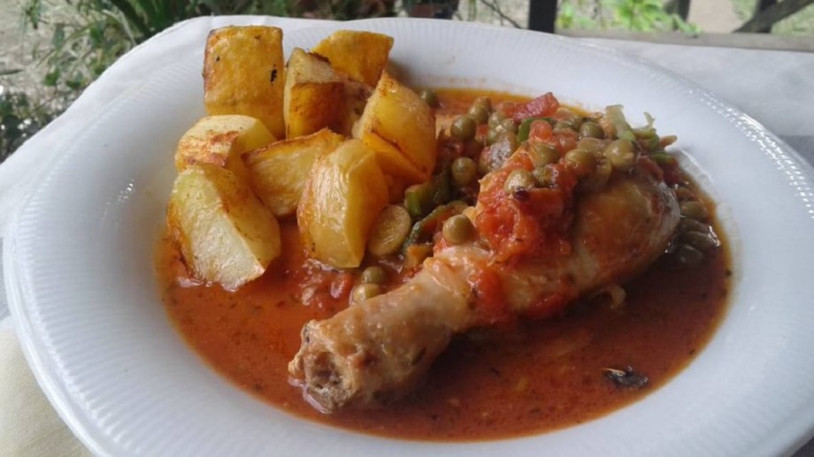 4. Incorporar tomate cubeteado y dejarlo reducir. Incorporar el pollo y el tomillo, cubrir con caldo, tapar y llevar a horno durante 30 minutos, colocarle la picada, dejar reposar y reservar.