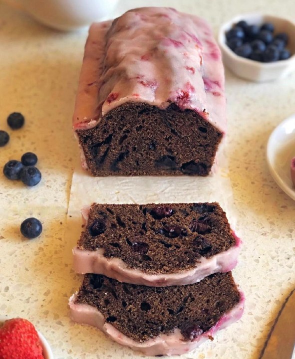 Para el glaseado, mezclar 7 cucharadas soperas de azúcar impalpable con pulpa de frutillas (para hacer la pulpa calenté en el microondas 2 frutillas con un poquito de agua hasta que se ablandaron y después las pisé con tenedor). Combinar esta mezcla con el azúcar impalpable hasta lograr una consistencia espesa. Agregar por encima del budín una vez que ya enfrió.