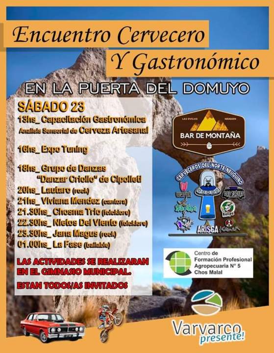 Este sábado 23 de abril, en Varvarco, Neuquén, habrá un gran encuentro cervecero y gastronómico que ha despertado mucha expectativa en la zona norte de esta provincia. Además de las comidas típicas de la región (empanadas, asado, tortas fritas, empanadillas) se podrá aprender a cocinar y degustar tacos de chivo a cargo del chef Nahuel Sepúlveda acompañados con diferentes estilos de cerveza artesanal de la región.