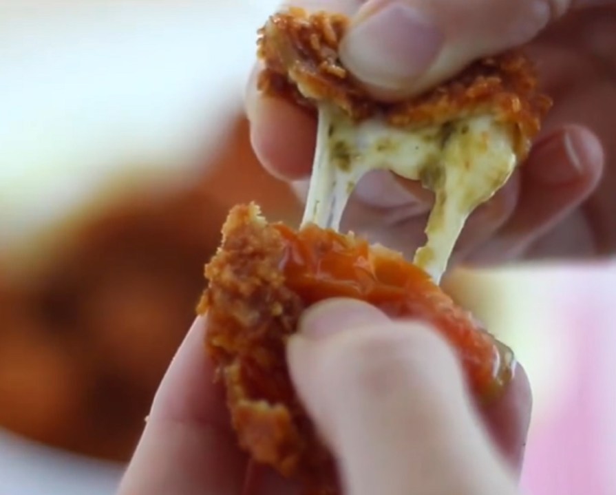Pasar el tomate relleno por harina, luego por huevo batido y por último, pan rallado. Repetir la acción de huevo y pan rallado una segunda vez, para darle una cobertura más crujiente. Para una manipulación más fácil, dejar el tomate en el bol y mover el recipiente de harina/huevo/pan rallado para que se cubra fácilmente.