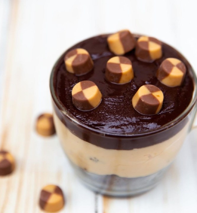 Retira los postres de la heladera y agrega encima una cucharada de la cobertura de chocolate. Refrigerá hasta que la cobertura esté firme, unos 45 minutos y serví decorando con una redondela marroc.