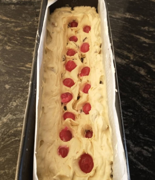 Agregar la fruta completamente escurrida y si se desea espolvoreada con un poco de harina extra, reservando las cerezas. Colocar en un molde (usé uno de 30x9x9) enmantecado y enharinado o enmantecado y con papel. Llevar la pasta hacia los bordes. Colocar las cerezas hundiéndolas un poco, para que luego se encuentren en todas las porciones.