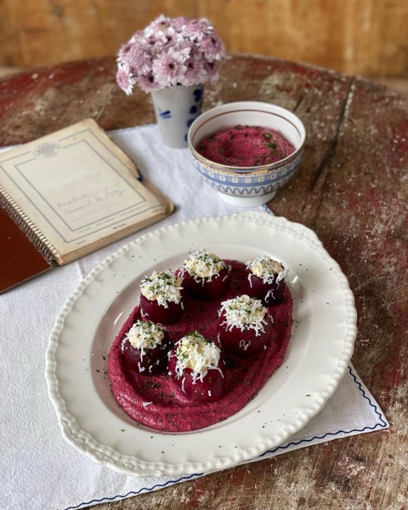 Hervir la remolachas, dejar enfriar y ahuecarlas un poco. Hacerles una base (guardar todo para hacer la crema después). Mezclar la cebolla picada y dorada en oliva con el queso blanco, yemas de huevo pisadas con tenedor, perejil picado, sal y pimienta. Rellenar y terminar la remolachas con la clara rallada por arriba.