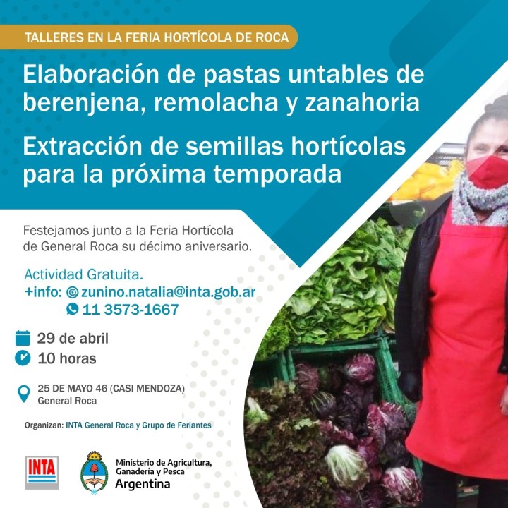 Los talleres que se ofrecerán son “Elaboración de pastas untables de berenjena, remolacha y zanahoria”, que será brindado por Gladis Huesa y “Extracción de semillas hortícolas para la próxima temporada”, a cargo de Pablo Vásquez. Son organizados de manera conjunta con los feriantes y la Agencia de Extensión Rural General Roca del INTA. No se requiere inscripción previa.