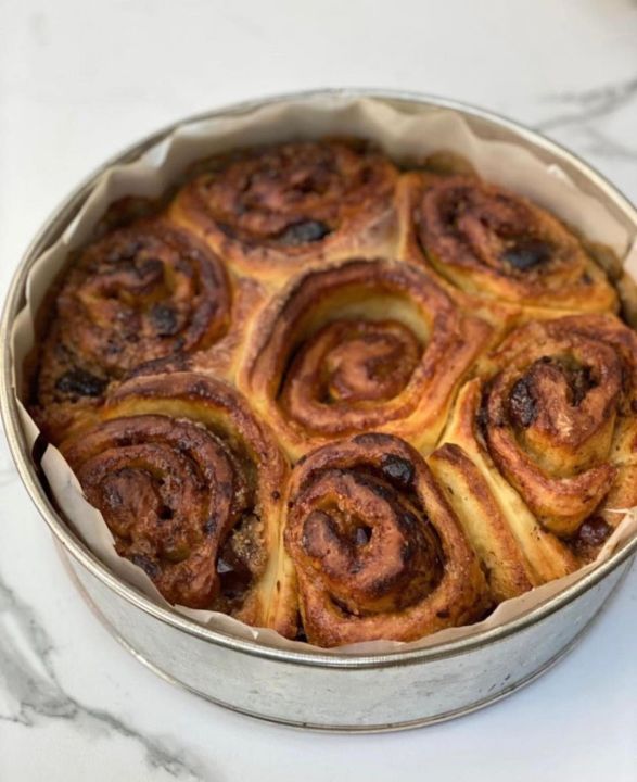 Extienda la manteca uniformemente sobre la masa y esparza con la mezcla de azúcar rubia y canela, luego el chocolate y enrolle en forma de cilindro. Recorte los extremos, luego córtelos en trozos de 5 cm de grosor y distribuya los rollos en el molde de manera uniforme dejando un poco de espacio entre ellos, con el lado cortado hacia arriba, cubra con un paño de cocina y deje reposar hasta que los lados de los rollos se toquen (de 45 minutos a 1 hora).