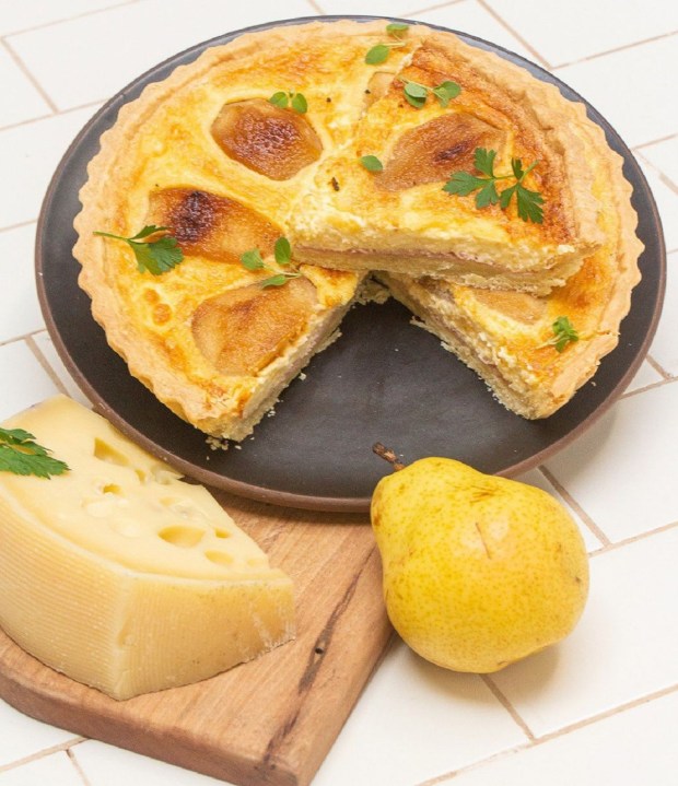 Para la masa: Comenzamos colocando 500 g de harina 0000, 250 g de manteca y 5 g de sal en una procesadora y preparamos un arenado. Luego, incorporamos 120 cc de agua, 1 huevo y continuamos mezclando hasta obtener un bollo. Envolvemos en film y llevamos a frío. Para las peras, cortar en cuarto dorar con manteca y miel.