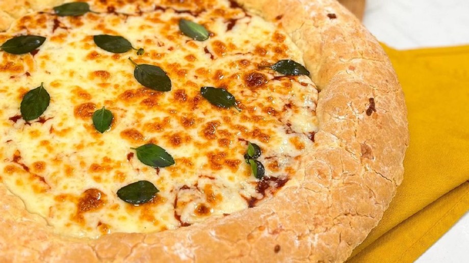 Estirar la masa, sobre una asadera aceitada. Encerrar los bastones de queso mozzarella en el borde presionando bien. Cocinar en horno previamente precalentado a 170/180º C (horno medio) por 10 a 15 minutos, es para precocinar la base. Terminar con salsa y más queso mozzarella rallado. Gratinar. Decorar con albahaca y aceite de oliva.