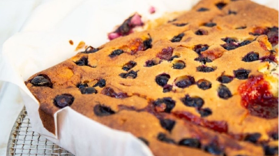Verter la mezcla el molde previamente enmantecado y espolvorear por encima los frutos rojos restantes. Hornear durante 45minutos hasta que, al insertar un palillo, éste salga limpio.