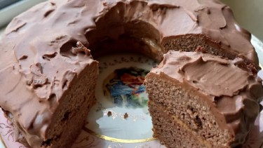 Batir los líquidos y agregar los secos mezclados (el cacao amargo tamizado). Llevar a molde savarín enmantecado y cocinar en horno precalentado 180° C por 25 minutos. Dejar enfriar y cortar.