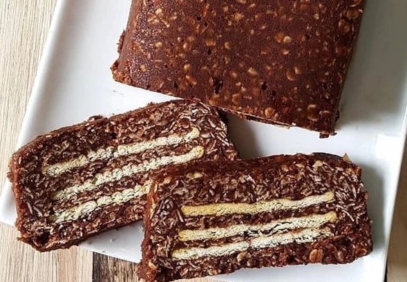 Fundir en el microondas o a baño maría el chocolate picado, la manteca cortada en cubitos y el azúcar. Añadir la avena y mezclar. Cubrir la base del molde con una capa del chocolate, luego una capa de Galletitas, una capa del chocolate, otra de galletitas y así hasta terminar con el chocolate, apretando cada capa con una espátula, una cuchara o la mano, para compactar bien el turrón.