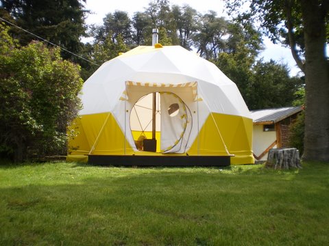 Cuentan con la forma y la filosofía del Glamping. Dentro de cada uno hay una cama matrimonial ubicada sobre un entre-piso, dos camas de 1 plaza en planta inferior, un living comedor, toda la superficie revestida con piso flotante y calefacción, microondas, heladera, pava eléctrica y un deck con parrilla.