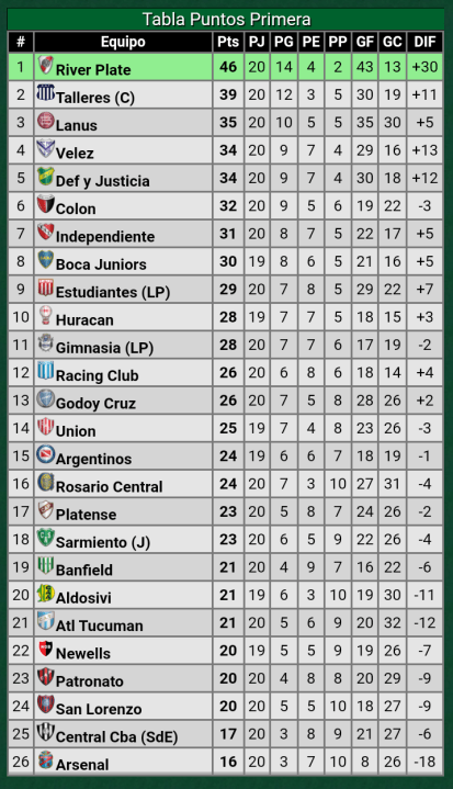 A pesar de la extraordinaria campaña de Talleres de Córdoba, la coronación en la Liga Profesional de Fútbol está en las manos de River después de haber cumplido con el compromiso de vencer a Patronato y conservar siete puntos de ventaja cuando quedan apenas 15 por jugarse.