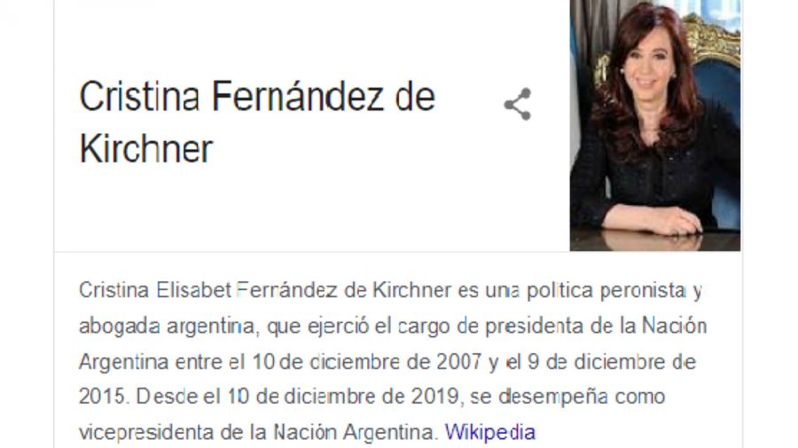 Al ingresar el nombre de la expresidenta y actual vicepresidenta aparecía el "cargo" de "Ladrona de la Nación Argentina". Pasadas unas horas el buscador lo resolvió y explicó qué fue lo que pasó.