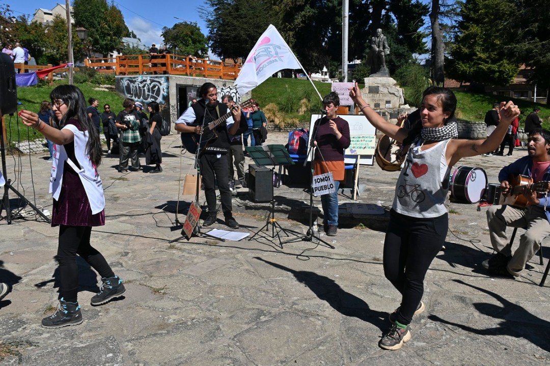 A pocos metros, la Unter llegó a la plaza Perito Moreno donde realizó una actividad cultural con músicos locales, mientras que se exhibían carteles con reclamos y entregaban folletos a los automovilistas.