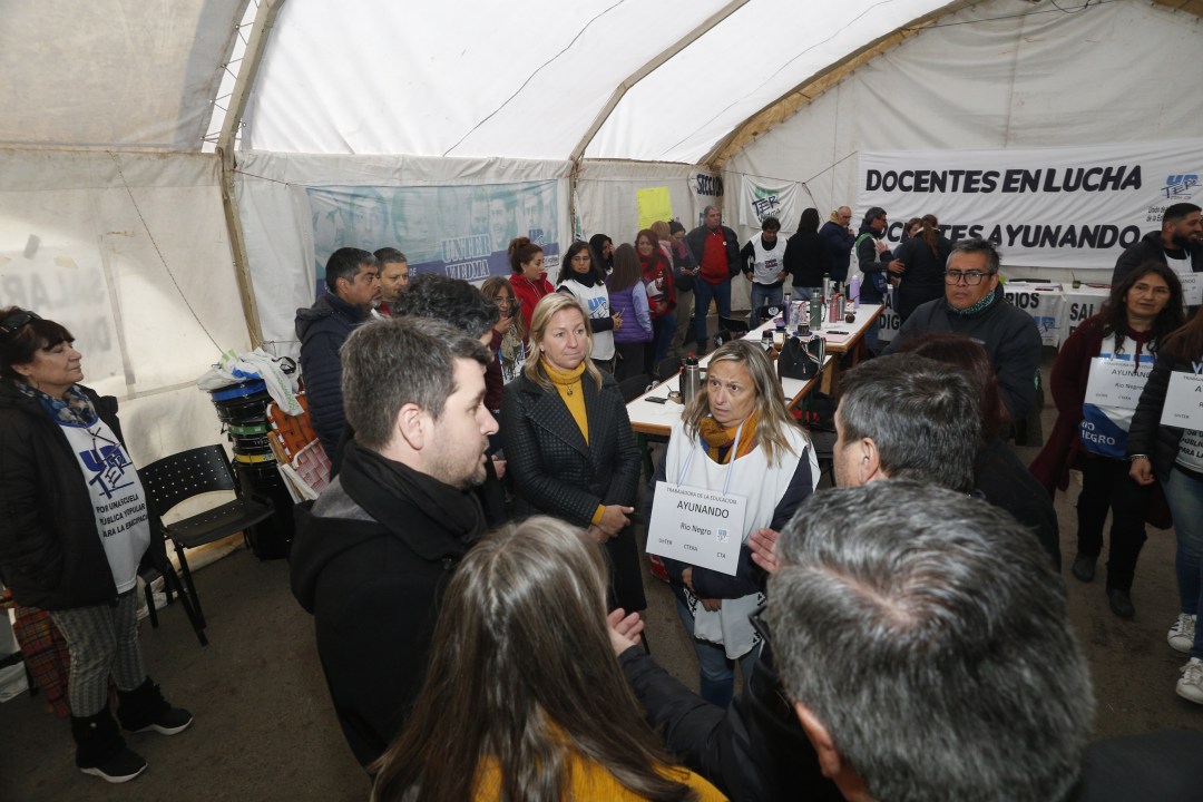 El gremio realizó un plenario de secretarios generales en la carpa montada en Viedma. Legisladores del Frente de Todos manifestaron su apoyo y presentaron un pedido de interpelación al ministro Stopiello.