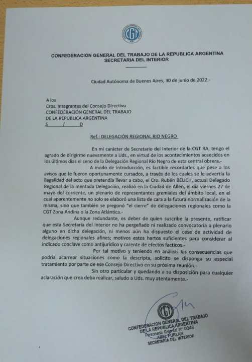 “Esta Secretaría del Interior no ha pergeñado ni realizado convocatoria a plenario alguno en dicha delegación, ni menos aún ha dispuesto el cese de actividad de delegaciones regionales afines; motivos estos hartos suficientes para considerar al indicado cónclave como antijurídico y carente de efectos fácticos”, dice textualmente el último párrafo de ese documento, remitido el lunes a los miembros del Consejo Directivo nacional de la CGT