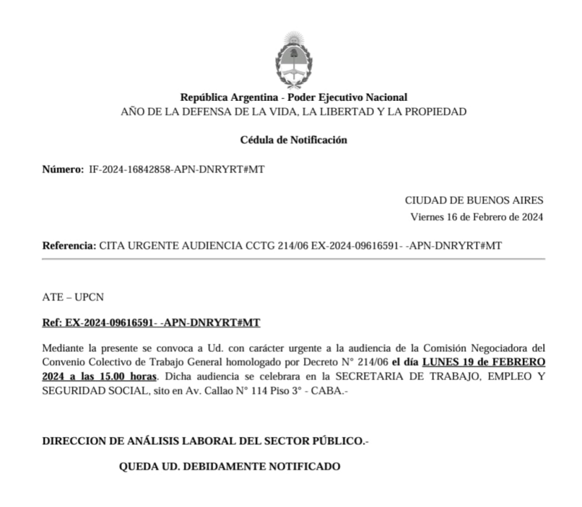 «En la conducción de ATE vamos a debatir las estrategias de negociación, pero si se mantiene la pretensión de licuar salarios y jubilaciones será muy difícil lograr un acuerdo. Las medidas económicas que aplica el gobierno de Javier Milei en pocas semanas han deteriorado de manera grave los ingresos en el Sector Público», posteó el sindicalista.
