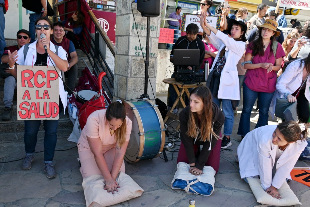 Hoy los residentes, en su último día de paro activo, se sumaron a la protesta de ATE en el Centro Administrativo Provincial con una actividad para la comunidad vinculada a una capacitación en RCP (Reanimación cardiopulmonar) y anunciaron su adhesión al paro convocado por la CGT el próximo 24 de enero.