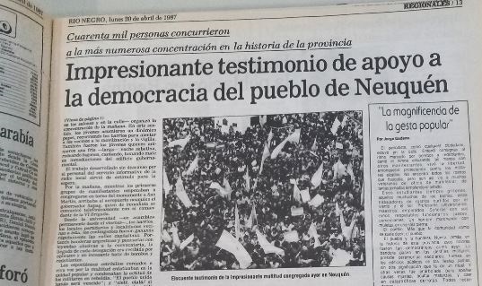 «Una multitud jamás vista en la historia de la provincia se movilizó (…) resueltamente dispuesta a ratificar su compromiso con los valores de la Democracia», publicó «Río Negro» en su tapa, al día siguiente de semejante acontecimiento.