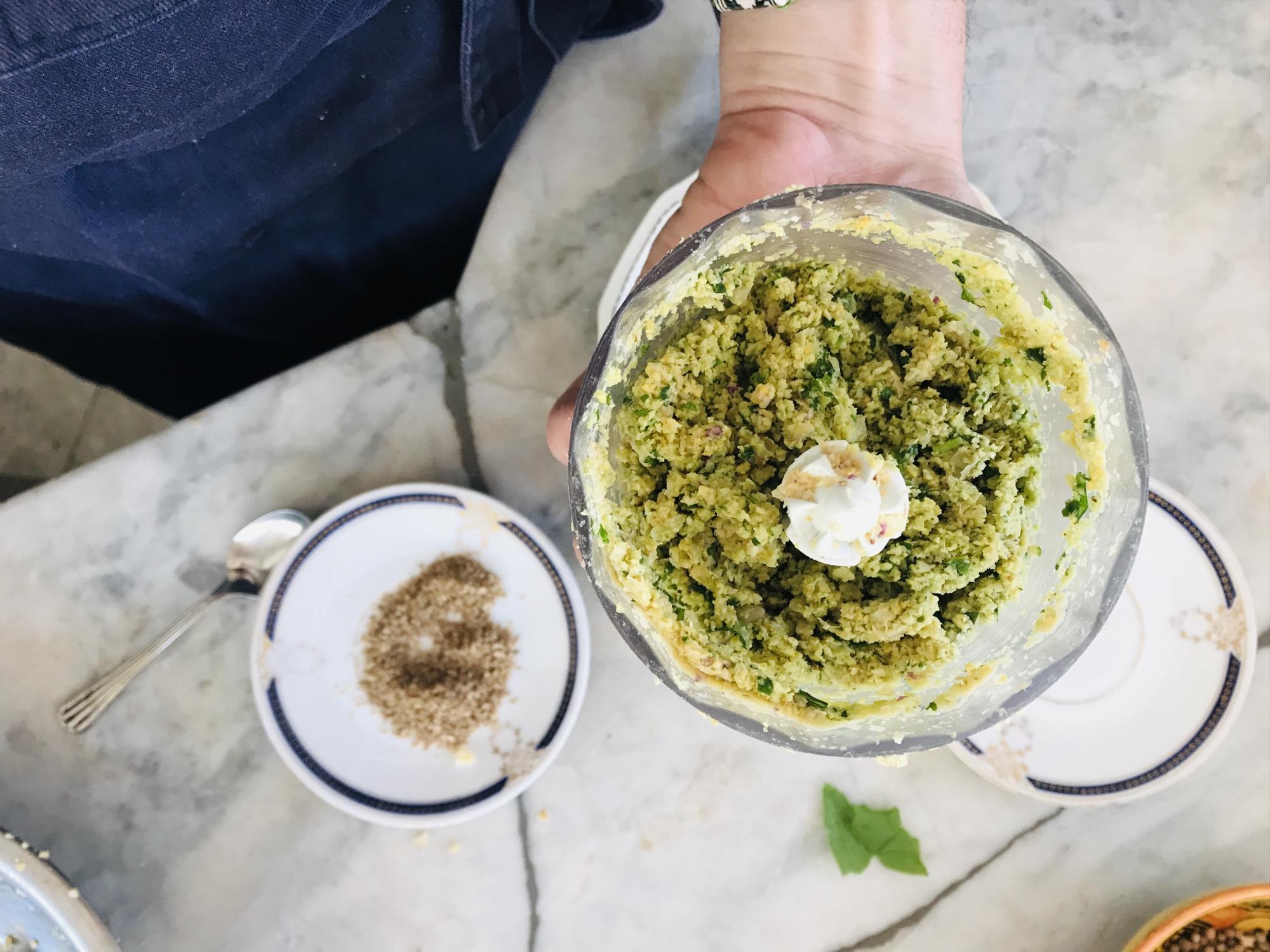 Procesar los garbanzos escurridos y crudos con mixer junto a la harina de garbanzos, la media cebolla y el ajo. La idea es lograr una pasta con textura similar a la del trigo burgol. Agregamos el cilantro, perejil, espinaca, comino, coriandro, sésamo y el aceite de oliva. Procesar diez segundos más.