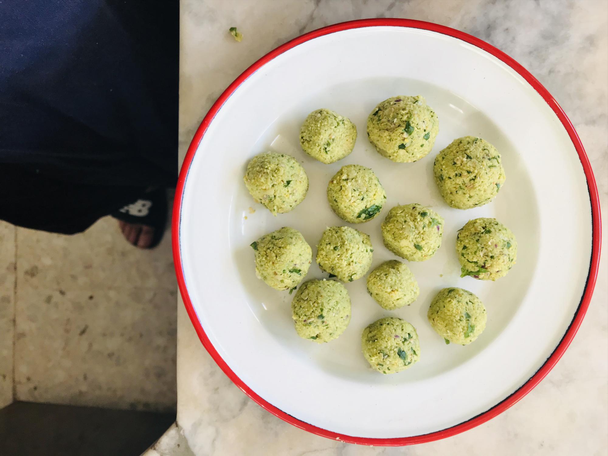 Sacamos el falafel de la heladera y probamos el aceite con un pequeño trozo de falafel. Si enseguida que sumergimos (un segundo) comienza a burbujear en la superficie, el aceite está listo.