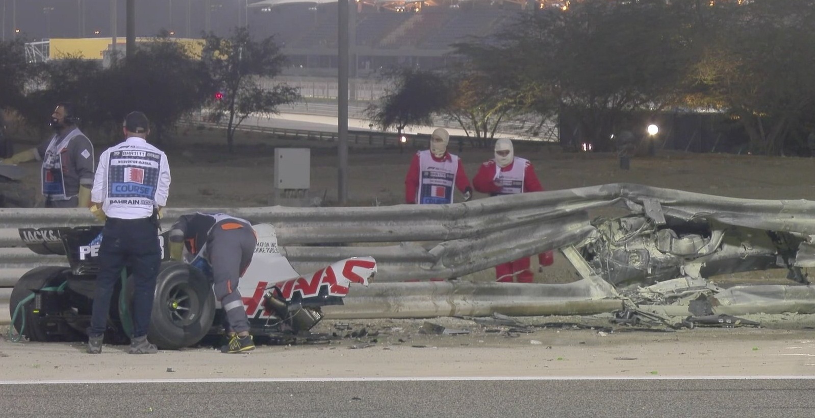 La prueba fue detenida inmediatamente con bandera roja y la pausa se extendió durante 80 minutos para permitir el traslado de Grosjean a un hospital cercano al circuito y la reparación de la zona del accidente.