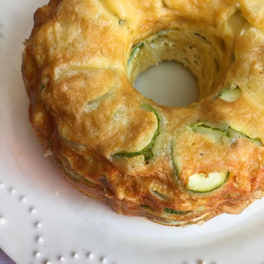 Batir apenas 4 huevos, diluir en otro recipiente 2 cucharadas de fécula de maíz en 1/2 taza de leche (yo usé vegetal) y agregar a los huevos. Incorporar 2 cucharadas de queso rallado, sal y pimienta. Cortar 2 zucchinis en rodajas bien finas, a cuchillo o usando mandolina. Aceitar un molde para horno o en mi caso usé un savarin. Colocar capas de zucchini intercalando con la mezcla de los huevos hasta completar 3/4 del molde. Cocinar en horno medio por 40 minutos hasta dorar.